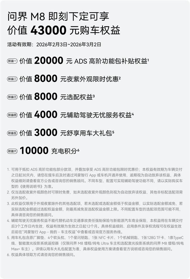 根据权益,在2026年2月3日至3月2日期间,下定问界M8的用户可享总价值43000元的购车权益,其中包括价值20000元ADS高阶功能包补贴权益、价值8000元夜紫外观限时优惠、价值8000元选配权益、价值4000元辅助驾驶无忧服务权益、价值3000元舒享用车大礼包及10000充电积分,涵盖智能配置、外观升级、用车保障等多个维度,诚意拉满。